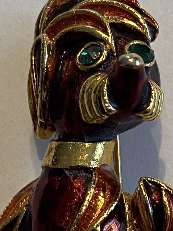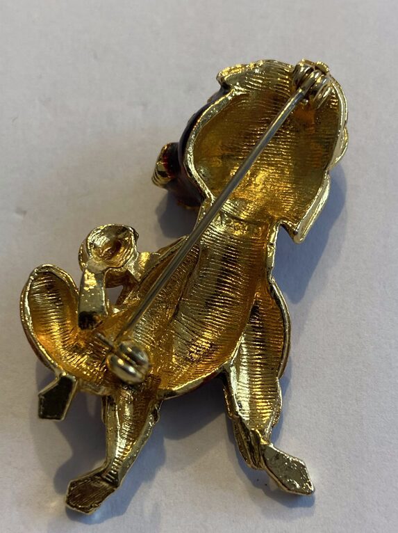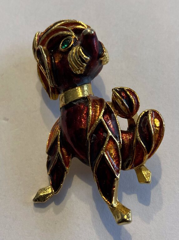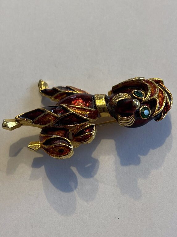 Francuski Pudel (French Poodle): Najbardziej ikoniczny motyw. Broszki często wykonane były w złotym odcieniu z fakturowanymi detalami imitującymi futro. Często posiadają czerwone lub zielone oczka z kryształków oraz emaliowane obroże.