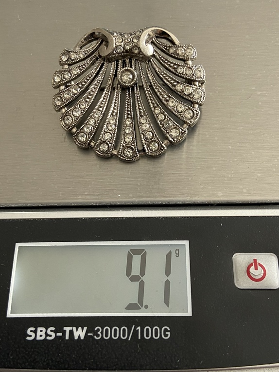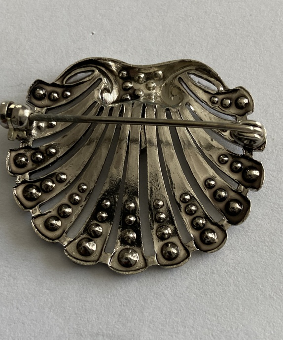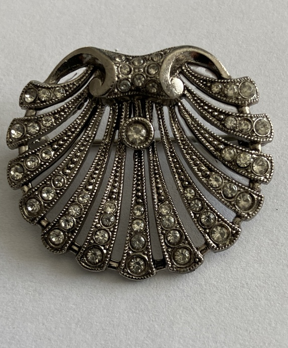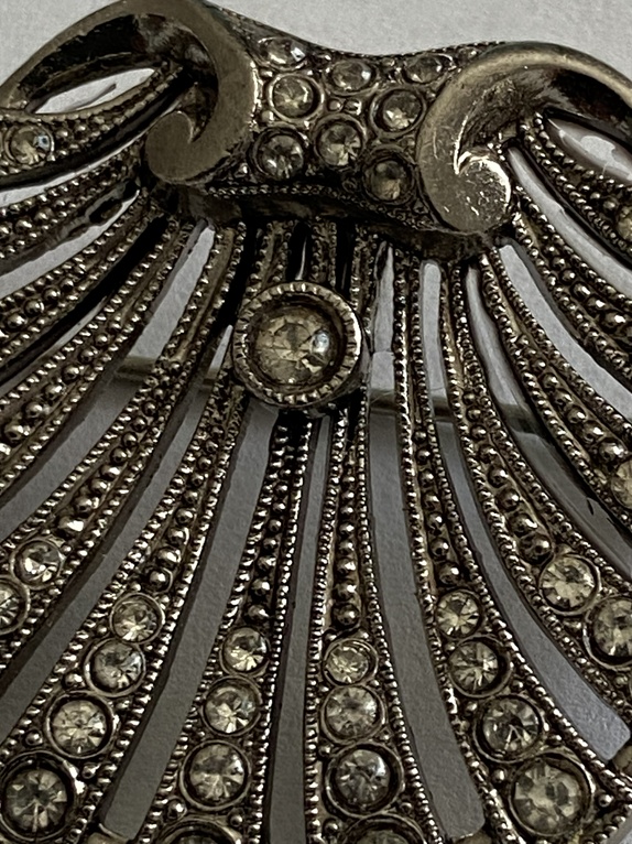 To broszka w stylu vintage,  srebro 835 i zdobiona  bezbarwnymi kryształkami (sztrasami). Jej projekt, przypominający wachlarz lub muszlę przegrzebka, jest charakterystyczny dla biżuterii z okresu Art Deco lub projektów inspirowanych tym stylem z połowy XX wieku.