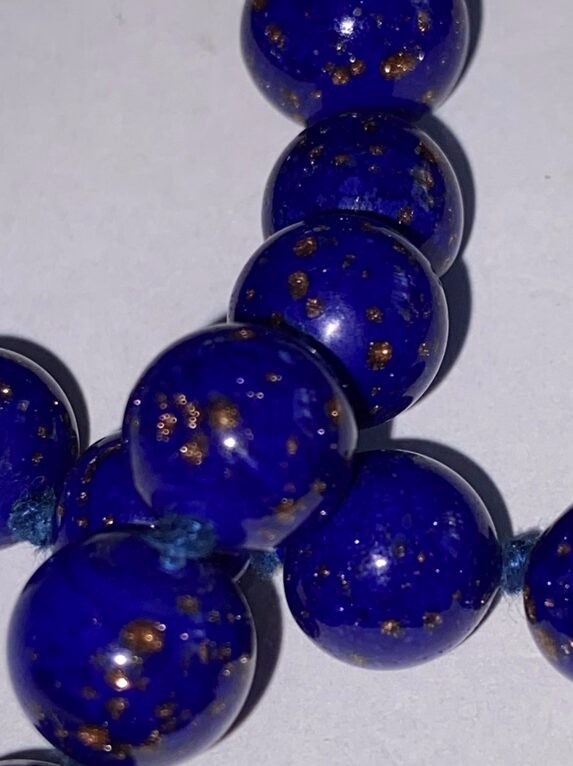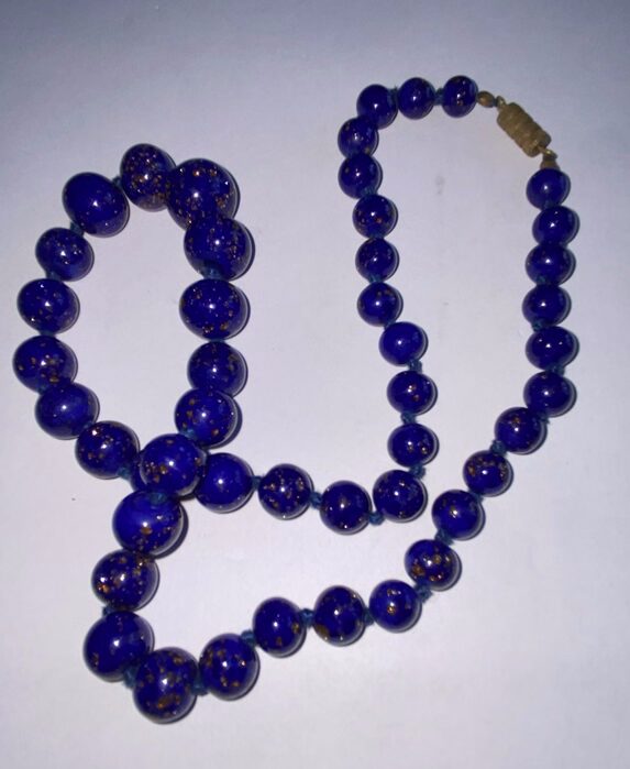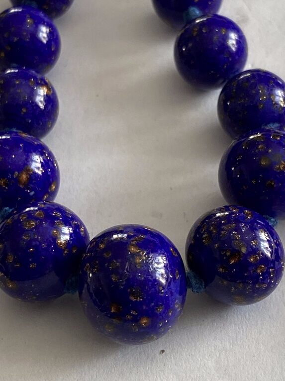 Bogato zdobione naszyjniki z kaboszonami lapis lazuli osadzonymi w żółtym złocie, często z dodatkiem pereł lub delikatnych grawerów.