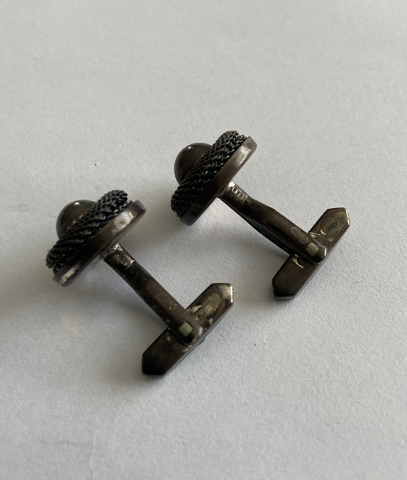 parę klasycznych, okrągłych spinek do mankietów o ciekawej teksturze wykonane z ciemnego, srebra 835