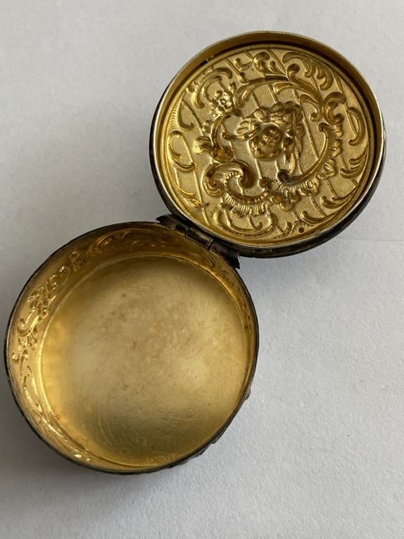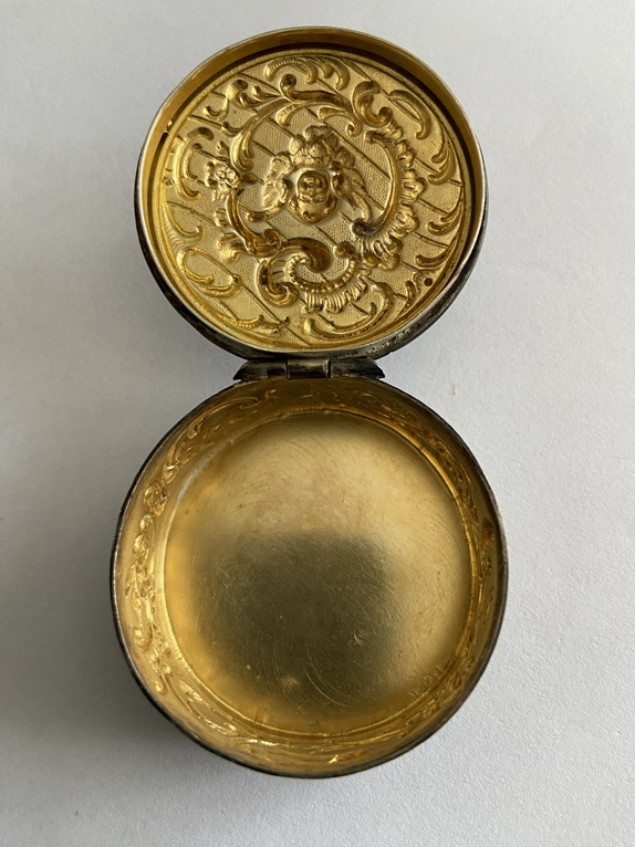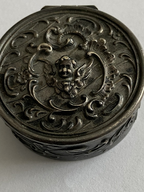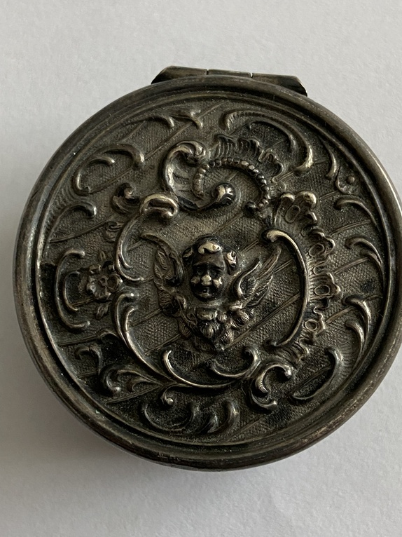 To srebrne puzderko z wizerunkiem anioła (putta) to antyczny przedmiot użytkowy, najprawdopodobniej wykonany na przełomie XIX i XX wieku. Tego typu małe, ozdobne pudełeczka, często nazywane pigularzami, służyły pierwotnie do przechowywania lekarstw lub drobiazgów, takich jak biżuteria.